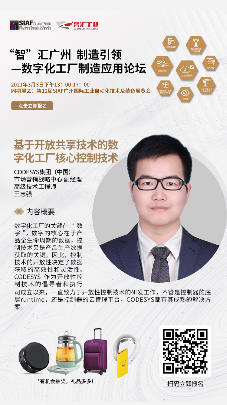 2021年3月3日-5日,SIAF(廣州國(guó)際工業(yè)自動(dòng)化技術(shù)及裝備展)將在廣州中國(guó)進(jìn)出口商品交易會(huì)展館B區(qū)舉行。CODESYS 受邀參加展會(huì)同期論壇:“智”匯廣州,制造引領(lǐng) - 數(shù)字化工廠制造應(yīng)用論壇,分享 CODESYS 數(shù)字化工廠整體解決方案。
