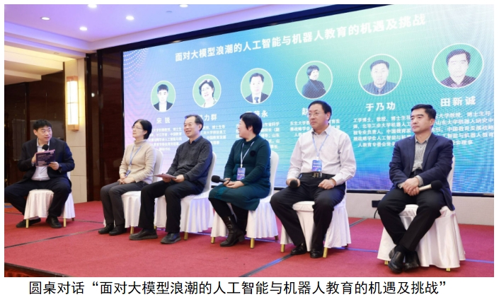 本次論壇上,來自山東大學(xué)、北京工商大學(xué)、齊魯工業(yè)大學(xué)、東北大學(xué)、北京工業(yè)大學(xué)的宋銳教授、田新誠教授、韓力群教授、曹茂永教授、趙姝穎教授、于乃功教授在主題為“面對大模型浪潮的人工智能與機器人教育之機遇及挑戰(zhàn)”的圓桌對話環(huán)節(jié),圍繞“以大模型為代表的AI工具對基礎(chǔ)教育有何影響?”、“大模型的快速發(fā)展將對人工智能教育的內(nèi)容和方法、手段帶來哪些變革?作為教育工作者我們該如何應(yīng)對?”、“大模型對機器人技術(shù)有何影響?機器人工程、智能制造工程等新工科專業(yè)應(yīng)該如何應(yīng)對?”、“大模型對于學(xué)生與老師之間的角色定位將產(chǎn)生何種影響? 如何更好地發(fā)揮它的作用?”、“大模型的快速發(fā)展對高校專業(yè)建設(shè)與人才培養(yǎng)將產(chǎn)生哪些影響?”等問題展開了深度研討,專家們從各個角度集思廣益、各抒己見,為人工智能助力人才培養(yǎng)及促進教學(xué)模式創(chuàng)新發(fā)展獻計獻策。