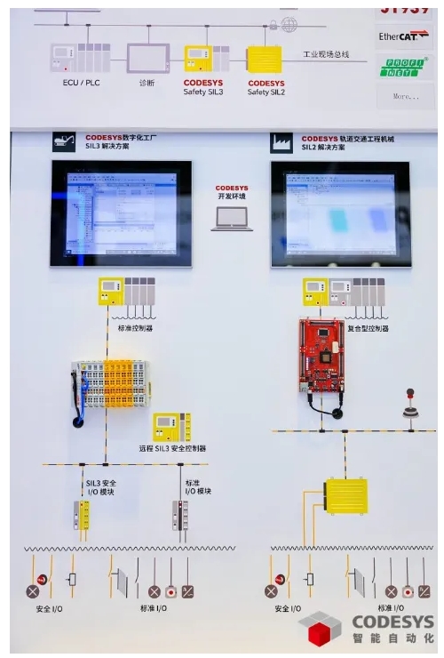 CODESYS Safety SIL 3(功能安全控制) 可用于工廠自動化領(lǐng)域,支持用戶開發(fā)符合 SIL 3 國際標(biāo)準(zhǔn)的安全控制器;CODESYS Safety SIL 2 (功能安全控制)則用于開發(fā)符合 IEC 61508 和 EN 13849 PLd 標(biāo)準(zhǔn)的安全控制器,應(yīng)用于工程機械和特種車輛等領(lǐng)域。同時 CODESYS 支持用戶使用 CODESYS EtherCAT 功能安全模塊開發(fā)實現(xiàn)功能安全目標(biāo)的 Safety 安全控制系統(tǒng)。