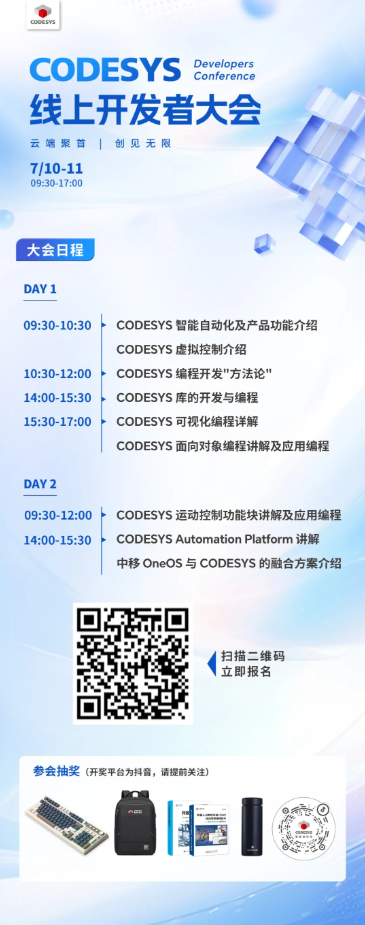 立即行動起來,加入 CODESYS 線上開發(fā)者大會,一起探索智能自動化的無限可能,為你的職業(yè)發(fā)展與技術提升注入新動力!讓我們攜手共進,在智能自動化的時代浪潮中勇立潮頭,創(chuàng)造更加輝煌的未來!